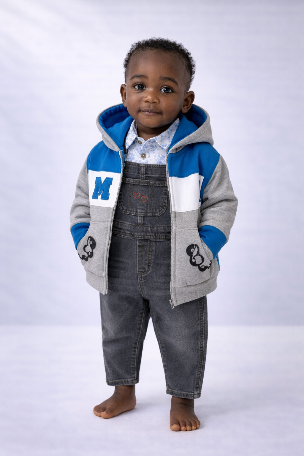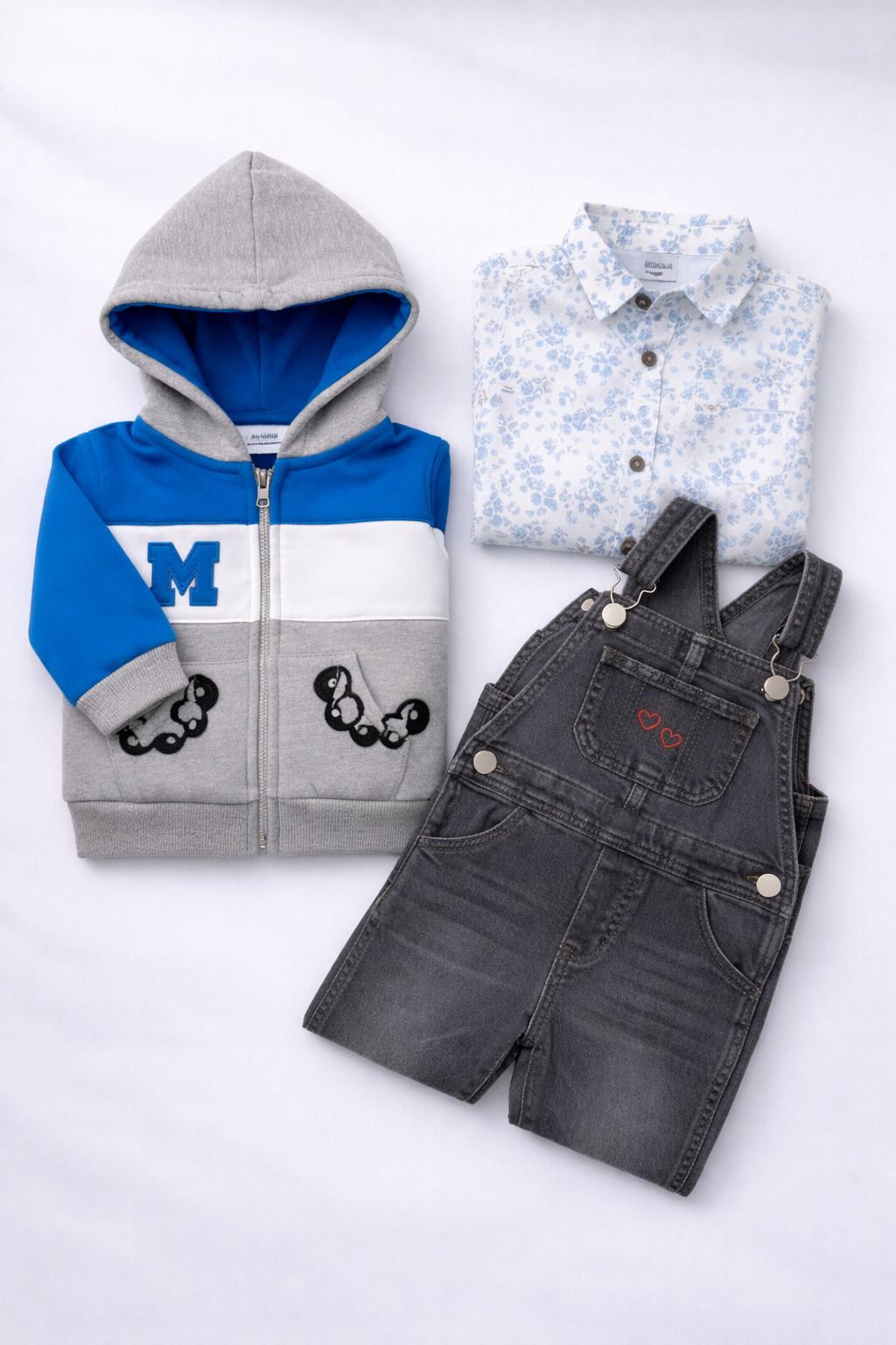 Offrez à votre enfant un look soigné et confortable avec cet ensemble coordonné. La veste à capuche grise et bleue aux motifs ludiques, la chemise blanche imprimée et la salopette gris foncé au détail cuir forment un trio pratique et élégant. Parfait pour les sorties comme pour les occasions spéciales.