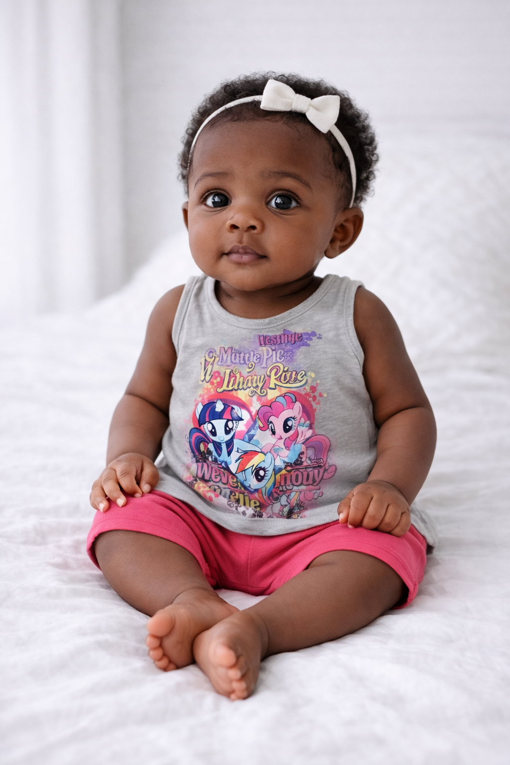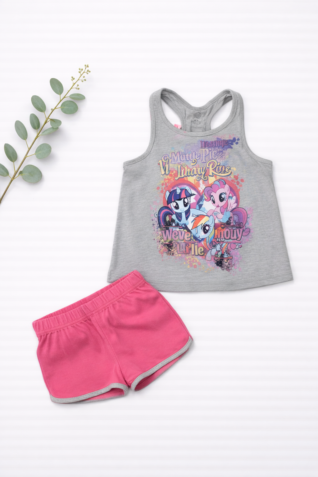 • Le débardeur gris à imprimé cartoon coloré s’accorde parfaitement avec le short rose à taille élastique.