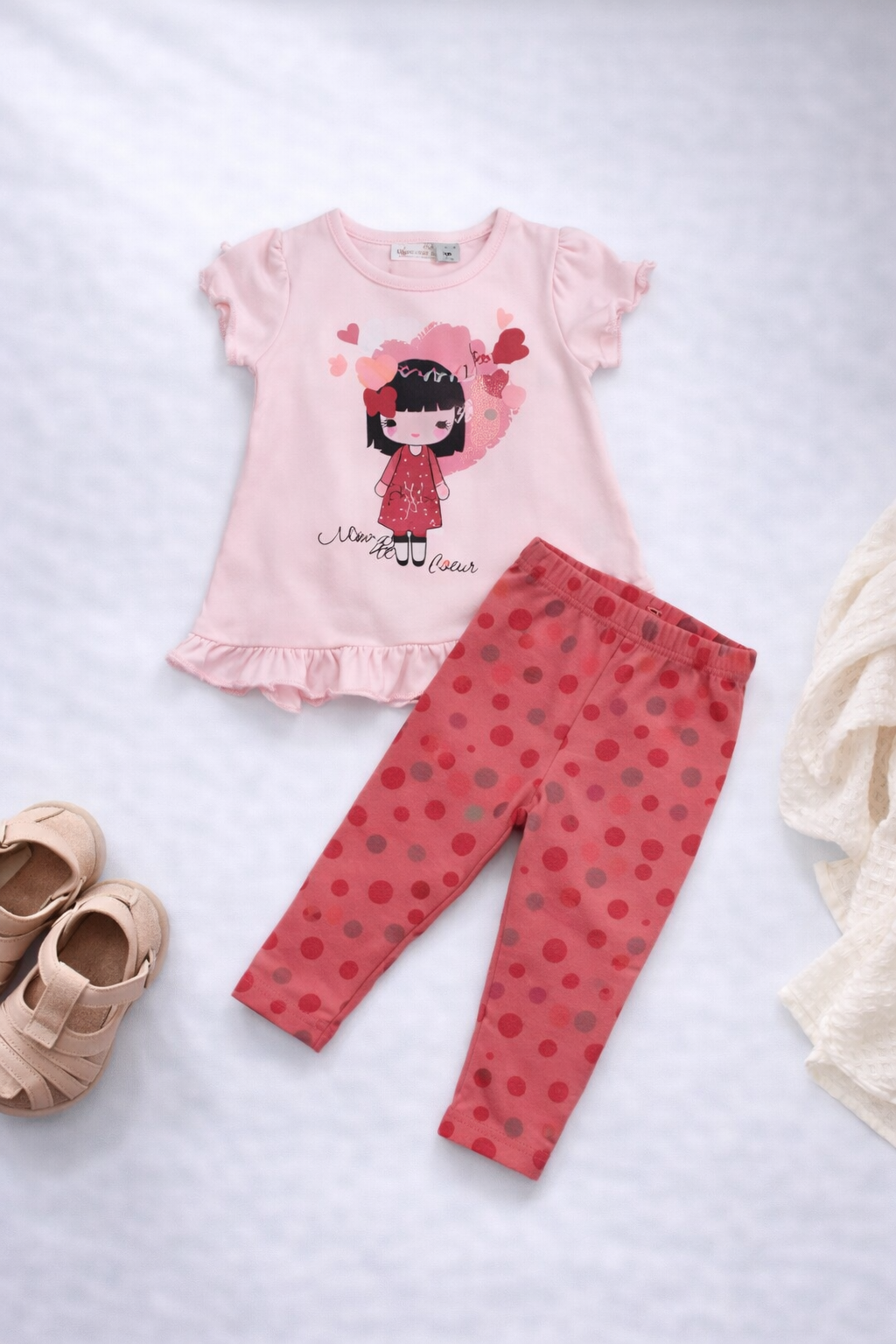 Offrez à votre petite un ensemble plein de charme avec ce duo 6 mois. Le t‑shirt rose à imprimé fillette et détails décoratifs s’accorde parfaitement avec le legging rouge à motifs noirs. Confortable, coordonné et joyeusement graphique, c’est la tenue idéale pour des journées décontractées.