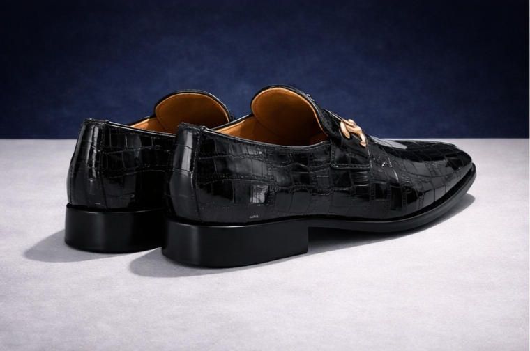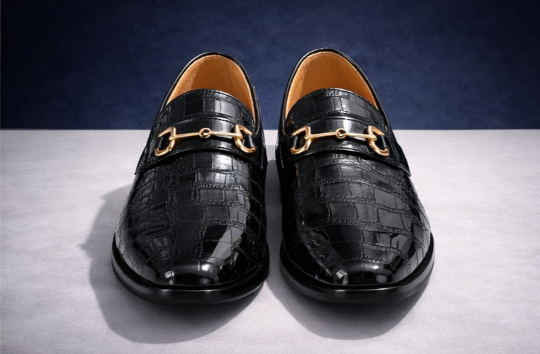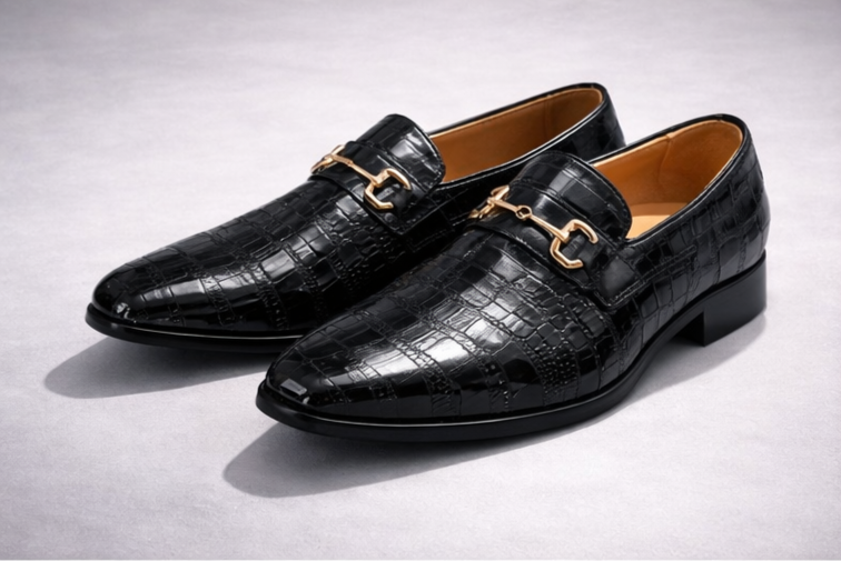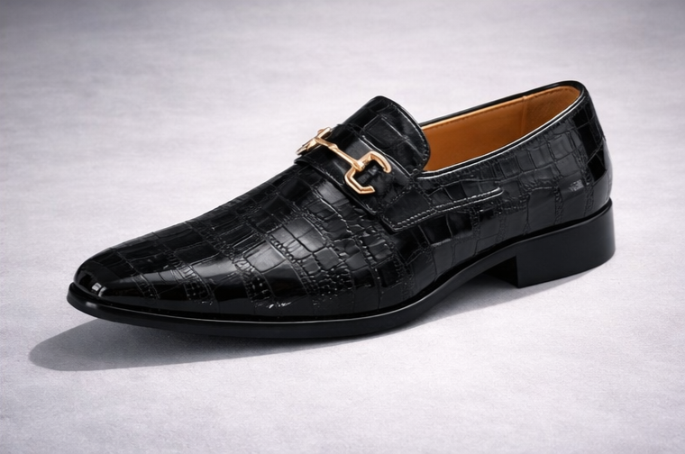 Affirmez un style audacieux et raffiné avec ces mocassins noirs au motif crocodile. Leur finition vernie brillante et le mors doré élégant en font la chaussure parfaite pour ajouter une touche de luxe et de caractère à vos tenues habillées.