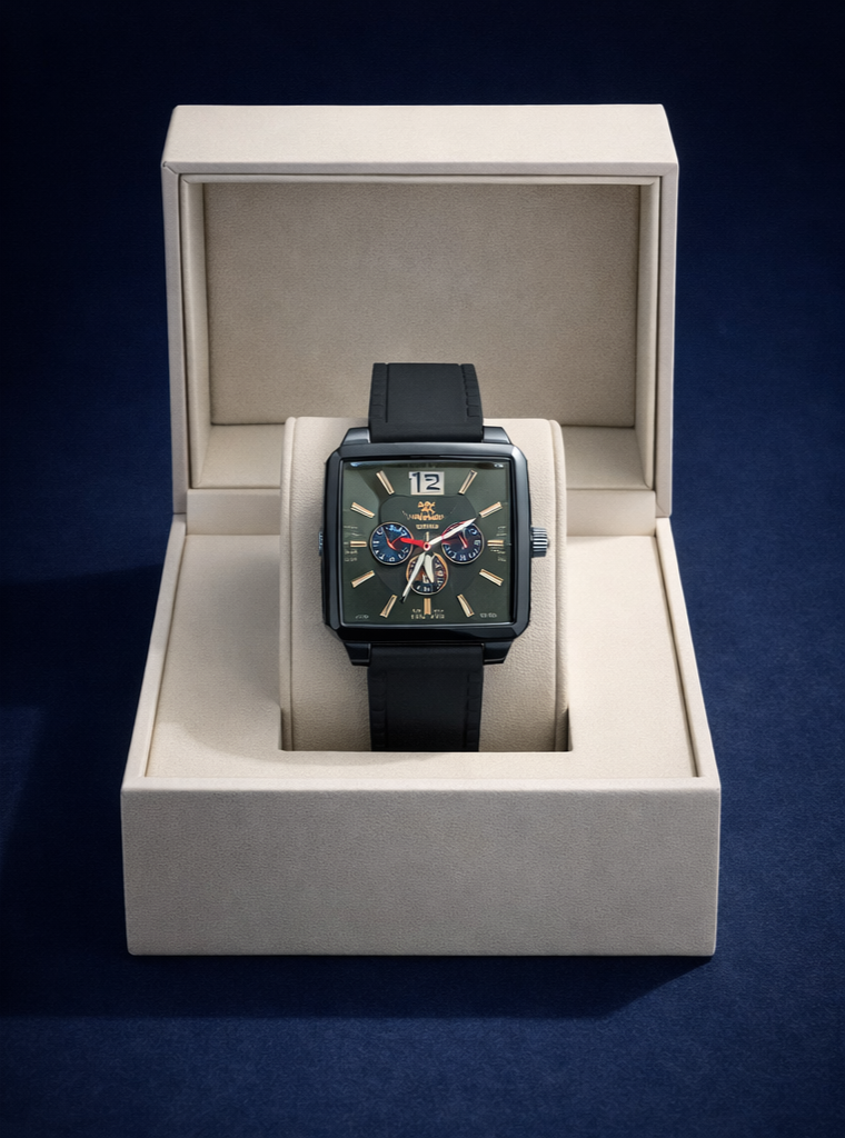 Montre Wanxida Design Carré, pensée pour un style moderne et affirmé avec son design carré. Son cadran bleu métallique unique et ses compteurs sportifs, associés à un bracelet en silicone noir confortable, en font un accessoire audacieux et contemporain, idéal pour un style affirmé.