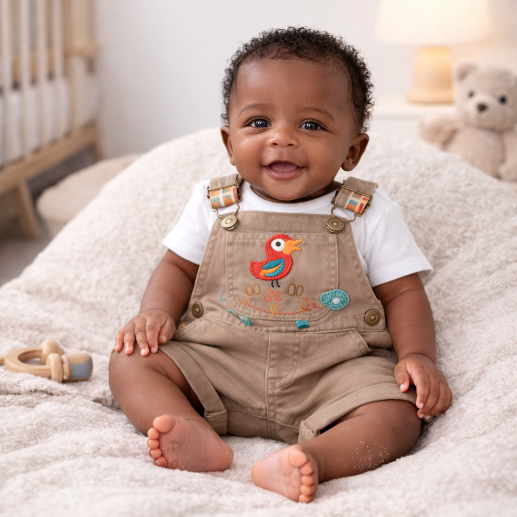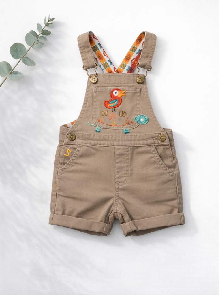 Craquez pour cette salopette courte en tissu marron doux, parfaite pour les bébés garçons de 3 mois. Ses broderies colorées dont un petit ballon orange et ses bretelles à rayures multicolores apportent une touche joyeuse et pleine de fantaisie. Confortable et pratique, elle est idéale pour les journées estivales.